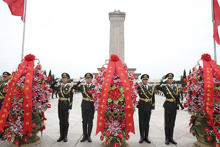9月30日上午,习近平等党和国家领导人来到北京天安门广场,出席烈士纪念日向人民英雄敬献花篮仪式。这是习近平整理花篮上的缎带。图片来源:新华社