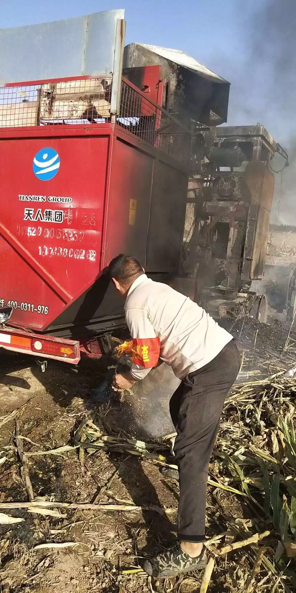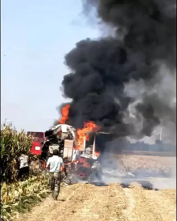 9月29日下午,滑县八里营乡东草坡村,该村李某用收割机在收割玉米,突然发现收割机起火燃烧,因灭火有些晚,价值十几万的收割机已被烧毁。