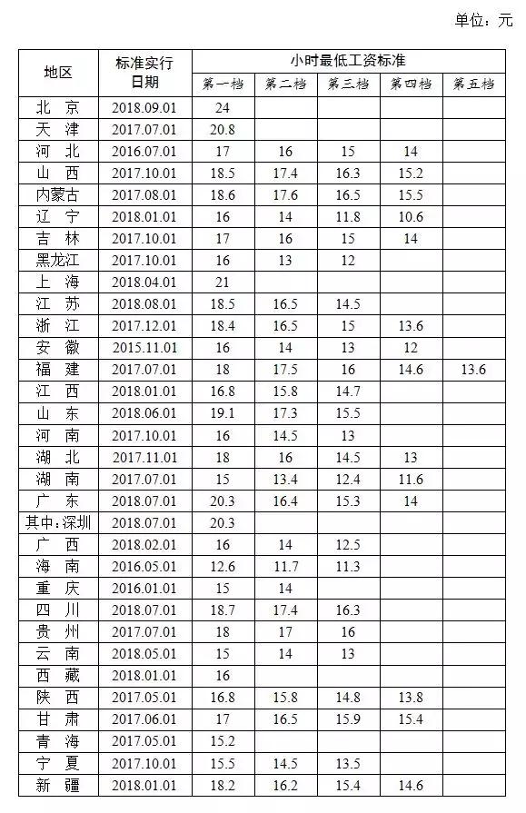 全国各地区小时最低工资标准情况(截至2018年9月),来源:人社部官网