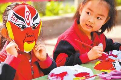 济源市梨林镇戏曲文化艺术旅游节现场,小朋友在学画戏曲脸谱。本报资料图片