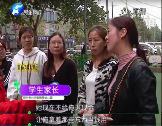 幼儿园不给退现金,而是给了些别的东西,诸如女士的卫生巾面膜,米面油,酱油醋这些生活用品,让家长们随便挑,来抵学费。家长们都不愿意要那些东西,只想要回学费,认为幼儿园是教书的地方,怎么能开起了超市,卖起了东西呢!