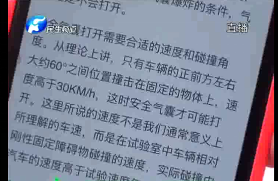 百度上的数据显示安全气囊打开需要车辆的正前方左右大约60°之间位置撞击在固定的物体上,速度高于30km/h。但这仅仅是理论上的数据,关于张先生这款车的具体起爆标准,还需要厂家官方的回复。我们仍希望安全气囊能在关键时刻起到真正的安全作用。