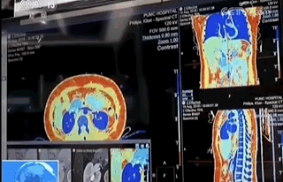 常规CT扫出来的图像,没有显示出来病灶。光谱CT成像以后一下子就能看出病灶在哪,而且还能把病灶纹理显得更清楚。帮助医生更好地去发现病情,诊断病情,可以减少患者45%的查率。