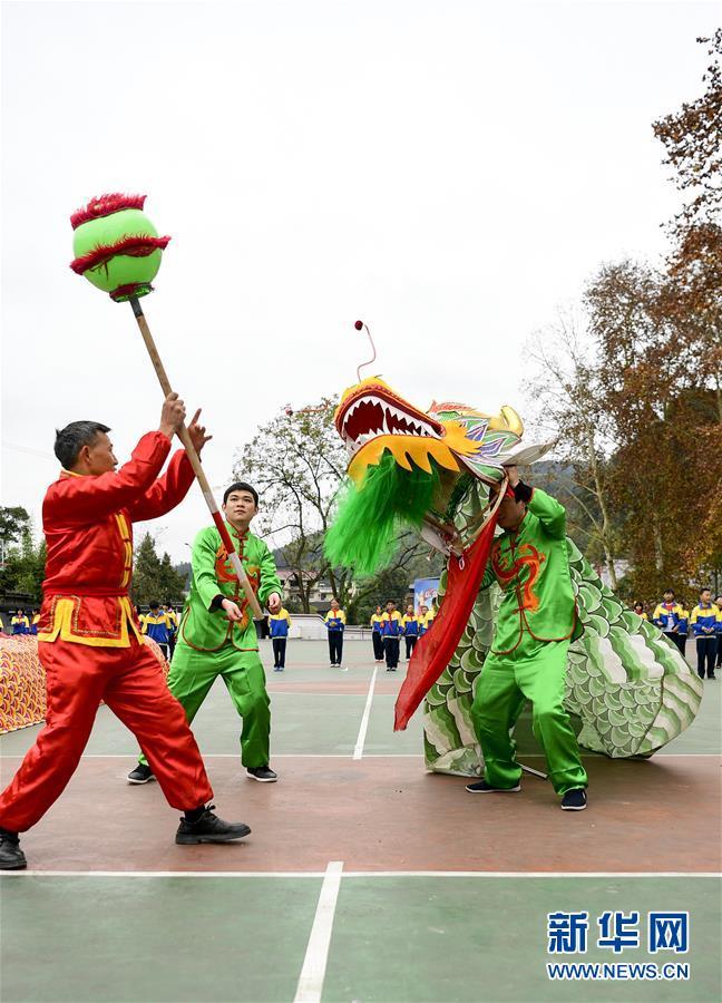 11月20日,在湖北恩施来凤县旧司镇中心小学,“地龙灯”传承人李玉生(左一)和学校老师表演“地龙灯”。近年来,湖北省恩施土家族苗族自治州来凤县旧司镇中心小学将国家级非物质文化遗产“地龙灯”引入校园进行推广,引导孩子们学习传统文化,体验传统文化的魅力。新华社发(唐俊摄)