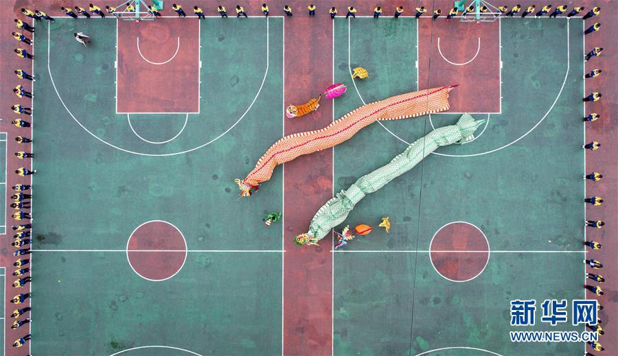 11月20日,湖北恩施来凤县旧司镇中心小学师生在练习“地龙灯”(无人机拍摄)。近年来,湖北省恩施土家族苗族自治州来凤县旧司镇中心小学将国家级非物质文化遗产“地龙灯”引入校园进行推广,引导孩子们学习传统文化,体验传统文化的魅力。新华社发(唐俊摄)