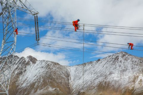 欲与天公试比高,“电力天路”建设者脚踏银线,行走在群山之巅。(国网青海电力)