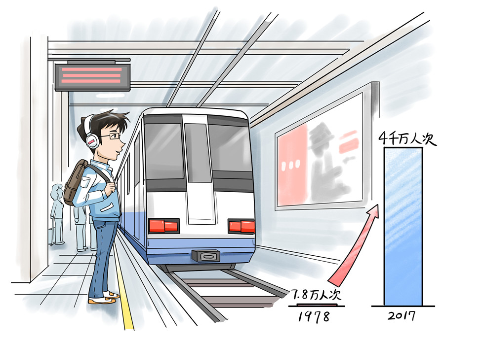 1978年只有北京、香港市民能够享受地铁带来的便利,线路也只有2条,总里程仅有29公里,日均客流量7.8万人次。而到了2017年,全国有35座城市建成了地铁,开通了161条线路,总里程比1978年增长172倍,达到4991.7公里,日均客流量全球第一,超4千万人次。