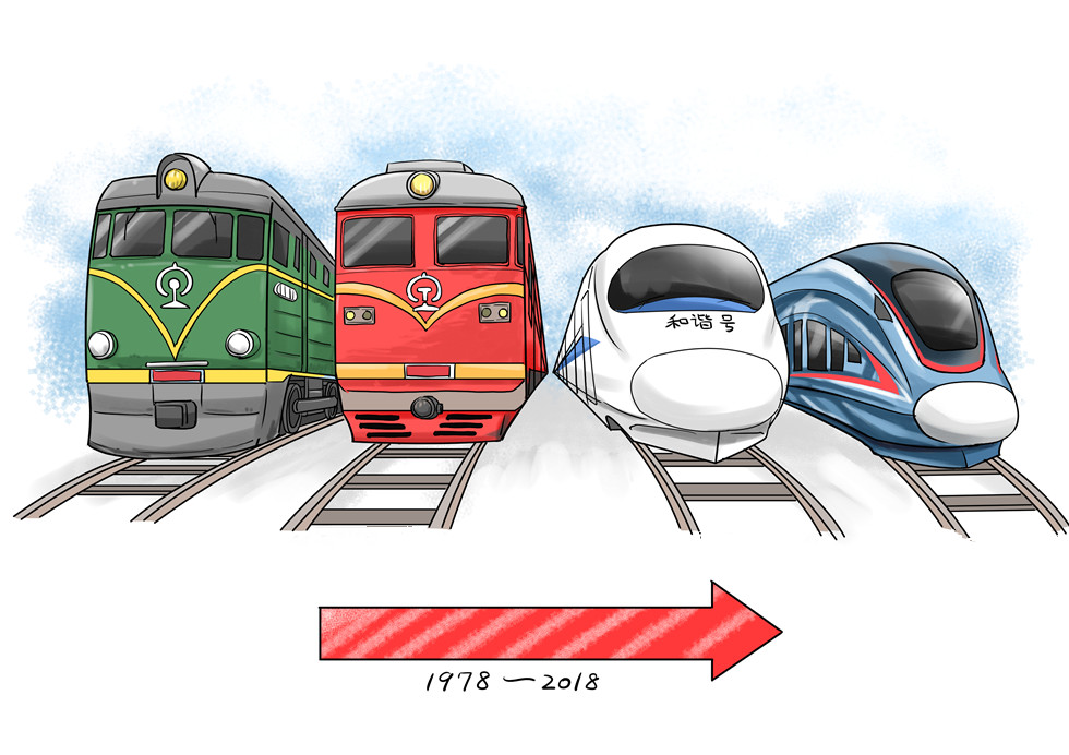 40年来,经过车辆迭代、7次大提速,改革开放初期平均时速不到40公里的绿皮车已经进化为如今标准时速350公里的复兴号。