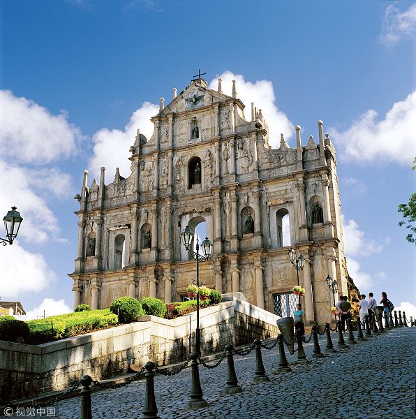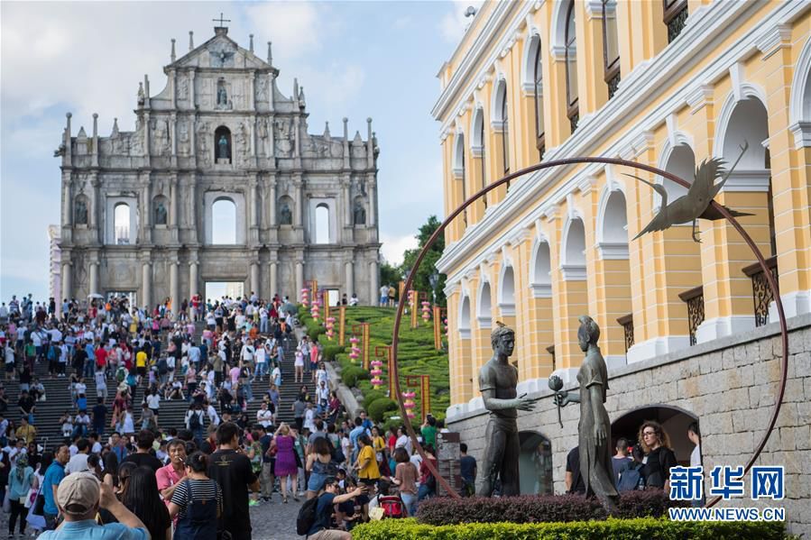 资料图:澳门著名景点大三巴牌坊、议事亭前地游人如织。新华社记者 张金加 摄