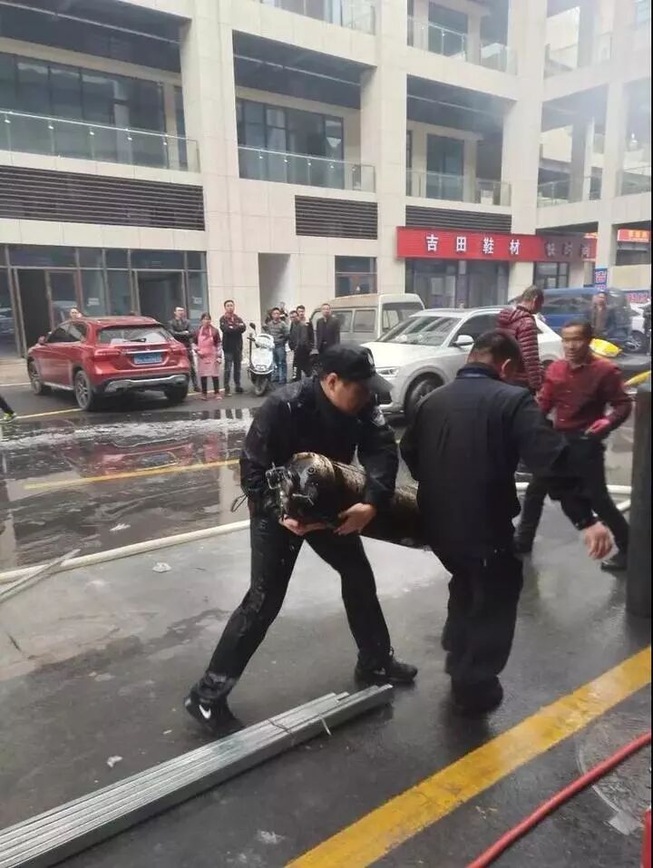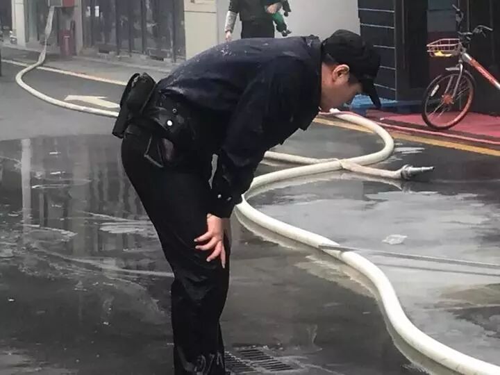 一边是易燃易爆的乙炔瓶口喷出火苗,一边是商业中心来来往往的人群,匆匆赶来的民警在救火结束后,衣服裤子湿透,半俯着身用双手强撑膝盖,累得直不起身。他想尽力关掉漏气的乙炔瓶开关,最后却因吸入毒气晕倒在地,最后失去意识倒向地面……