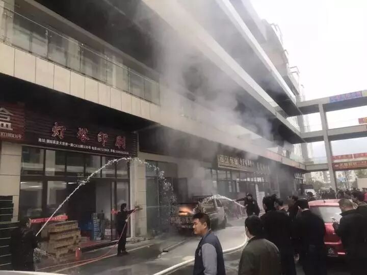 人来人往的商业中心附近,停在店铺边的一辆小货车后车厢突然窜出火苗。