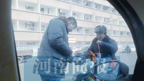 1月2日下午3点30分左右,在郑州市经南五路与经开第二大街附近,收费员张程威正跑前跑后为停车的车主服务,一会指挥倒车,一会帮车主开车门。