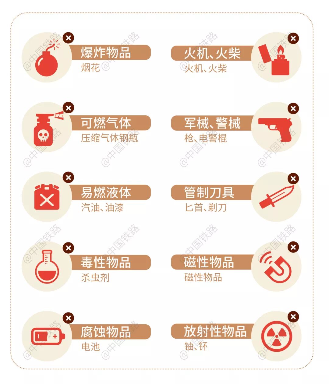 我的妈吖! 据民警了解 这名旅客在贵州老家开了一家小商店 这200个打火机是她刚从湖南进的货 打算带回贵州售卖 因为不了解 火车禁止和限制携带物品的相关规定 才有了这一波令人窒息的操作 为了避免小伙伴们 像这位旅客一样迷茫 小编再一次翻出压箱底的小本本 让你用最简单的方式看懂 乘坐火车禁止和限制携带的物品 都!有!哪!些! ↓↓↓禁止携带的物品 枪支弹药、管制刀具、易燃易爆物品、腐蚀性物品、剧毒物品以及其他危险品不能带进站乘车。若您在不了解铁路规定的情况下,携带危险物品到站乘车,请及时和民警或车站工作人员取得联系,便于妥善处理,确保大家旅行安全 。 ↓↓↓限量携带的物品 防晒喷雾以及冷烫精、摩丝、发胶、空气清新剂等自喷压力容器,属于限量携带物品,只可以携带不超过120毫升。 每名旅客最多可携带50条香烟进站乘车,超过数量的须出示相关部门出具的携带证明,符合要求后才可以进站乘车。 散装类酒(如散装白酒)是不能通过安检进站上车的,商品类瓶装的酒(未开封)是可以的,携带的数量上限为6瓶装的一箱。注意!白酒度数如果高于50度,旅客只能携带2瓶乘车。如果携带数量超出标准,您可以在车站办理托运。 有强烈刺激性气味的物品,或者带有异味的物品也不能携带。 所以…… 榴莲、臭豆腐啥的 小伙伴们还是在上车前吃够吧!