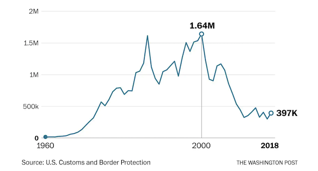 事实:根据美国海关边境保护局公布的数据,南部边境逮捕人数在2000年达到顶峰,共164万人,而此后一直在下降,2018年仅逮捕了39万7千人。
