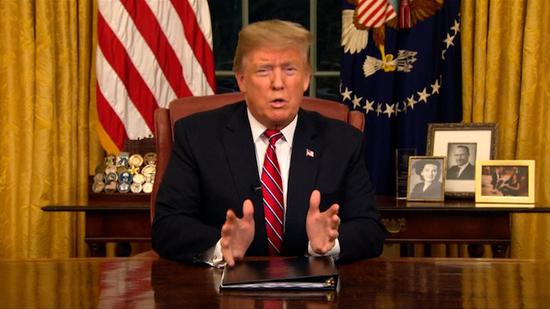 当地时间1月8日晚,美国总统特朗普就边境安全问题在白宫椭圆形办公室发表全国电视讲话。