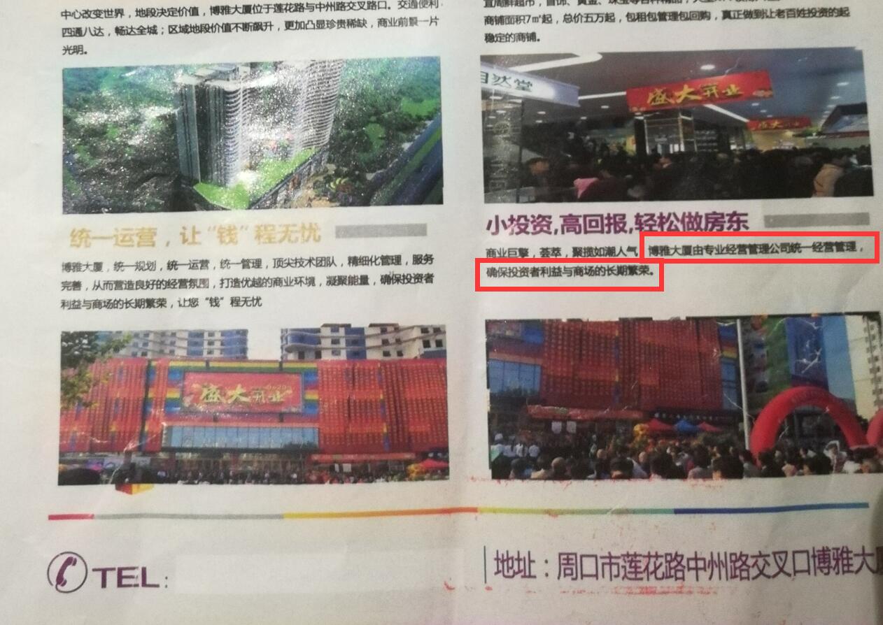 韩女士说,2016年底,她在街上闲逛的时候,收到一张宣传单,上面是博雅大厦商铺出售的内容。大河报?大河客户端记者从这张宣传单上看到,博雅大厦宣称这是“典藏黄金旺铺”,而且由专业经营管理公司统一运营管理,可以让购买者“小投资、高回报,轻松做房东”。此外,还有“确保投资利益”以及让购房者“钱”程无忧的字样。