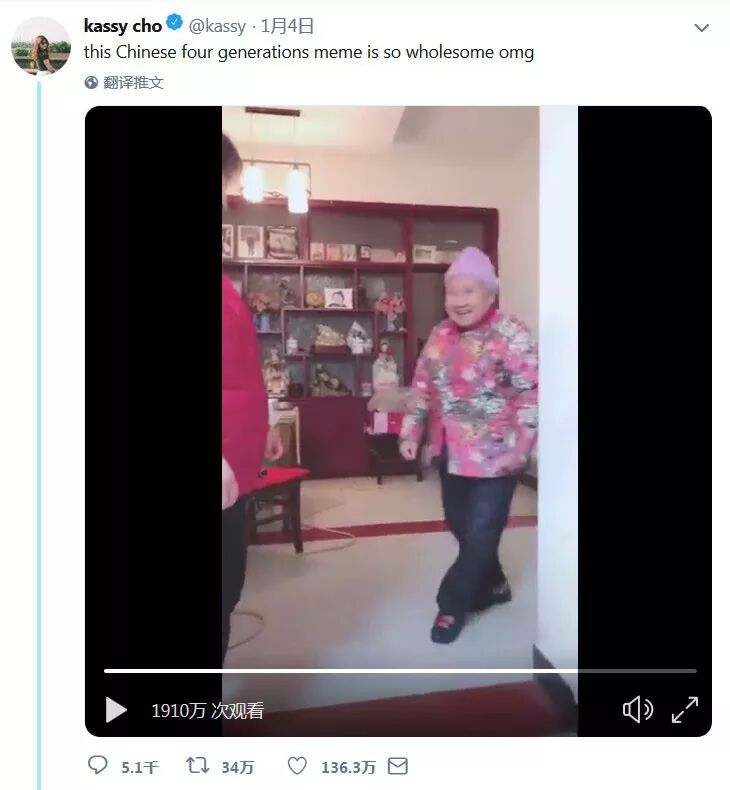 这则视频,以及一系列国内网友的同款“四世同堂”短视频,被Buzzfeed小编Kassy Cho发现并转发到推特上,迅速火遍全球。