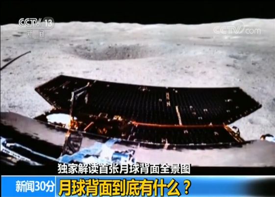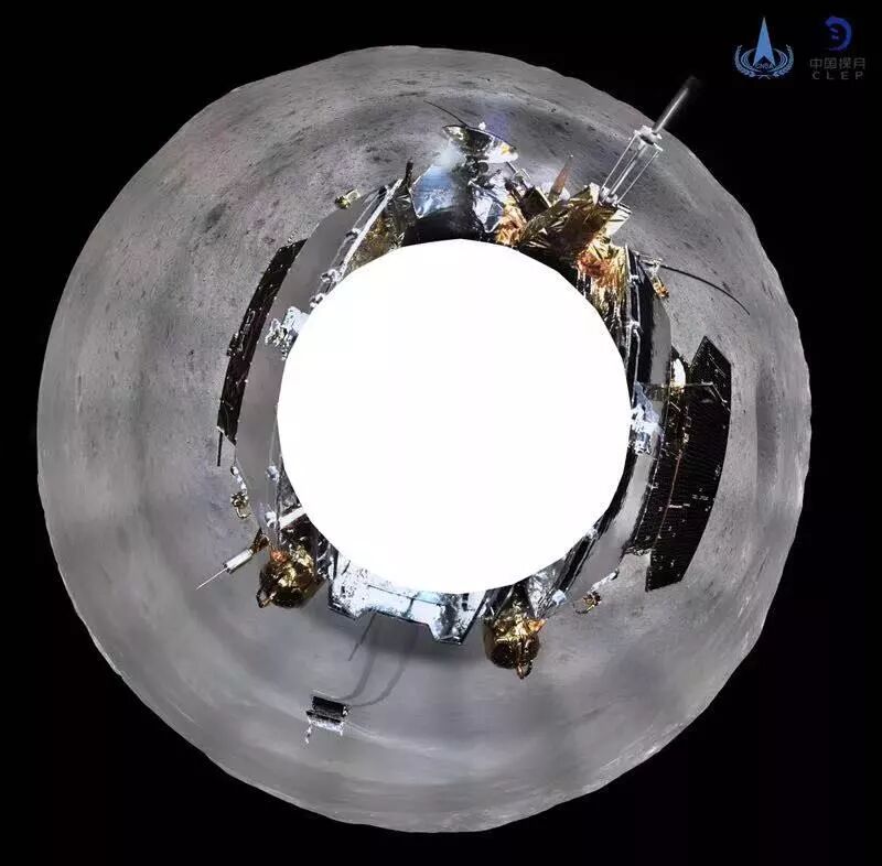 这张全景图由着陆器上的地形地貌相机进行四周旋转,拍成的80多张照片拼接而成。其中,科研人员首先观察了嫦娥四号自身设备的情况。