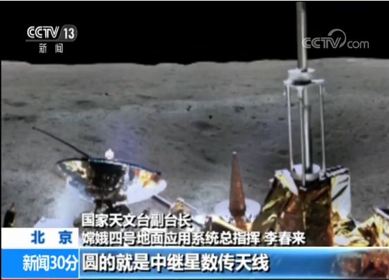 国家天文台副台长 嫦娥四号地面应用系统总指挥 李春来:这个圆的,就是对中继星的数传天线,这边我们可以看到展开的太阳能帆板和气瓶。远处的玉兔二号月球车正在午休状态。
