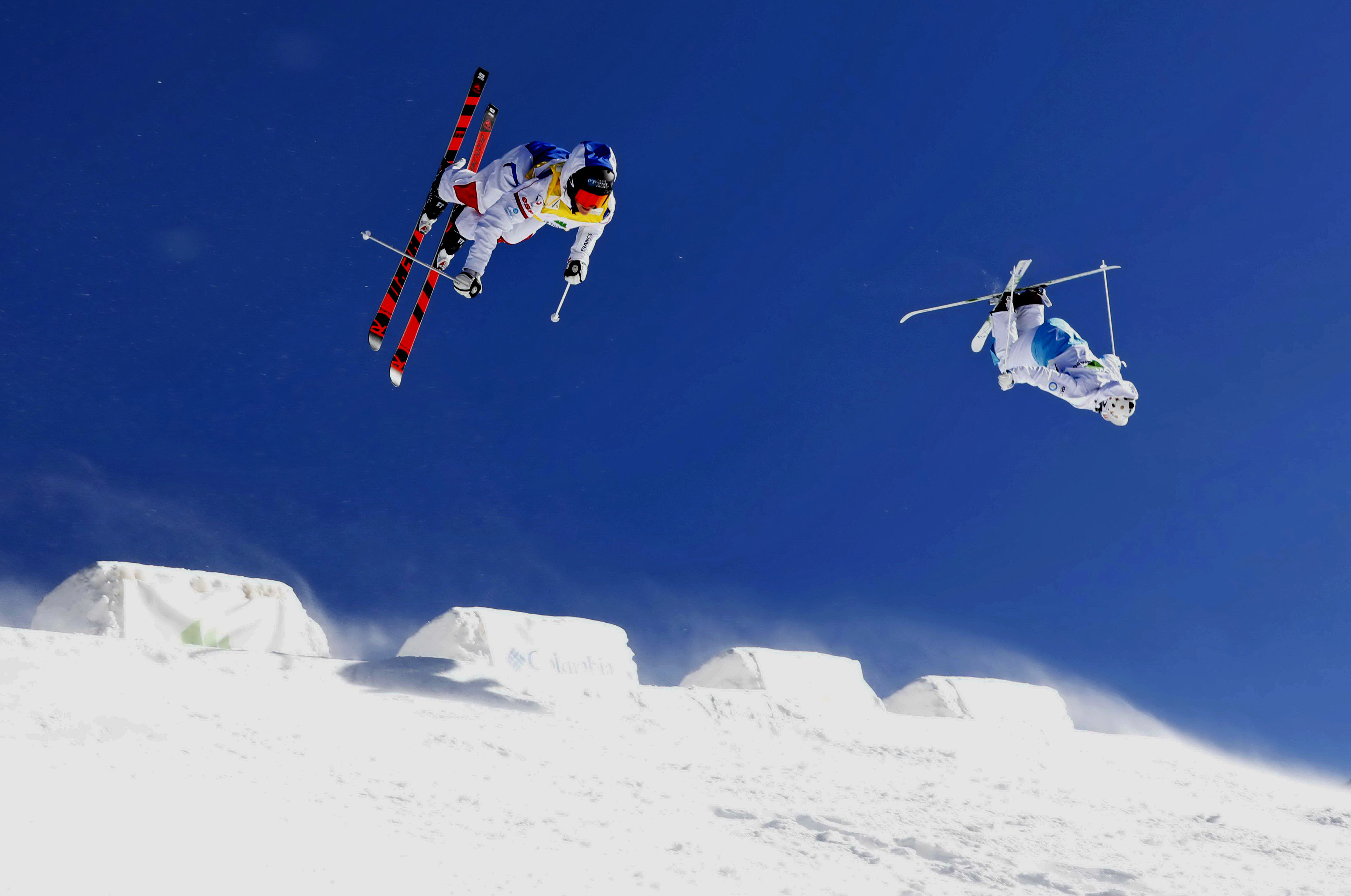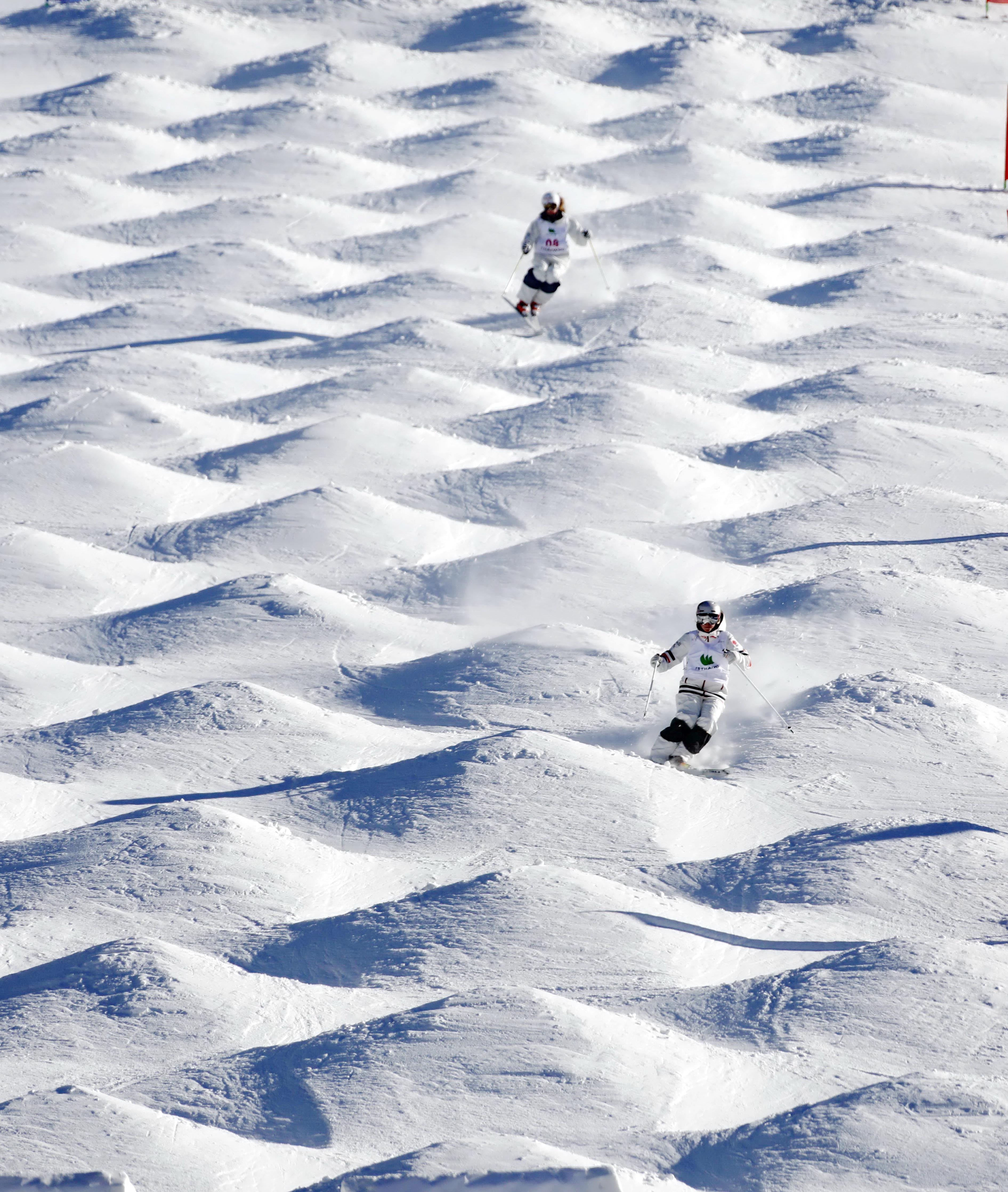 ↑这是运动员在张家口市崇礼区太舞滑雪场参加自由式滑雪雪上技巧比赛(2018年12月14日摄)。新华社记者杨世尧摄