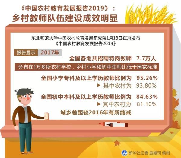报告称,2017年全国小学专科及以上学历教师比例为95.26%,较2016年提高1.61%,其中农村为93.80%,城乡差距为4.60%,比2016年缩小2%。全国初中本科及以上学历教师比例为84.63%,比2016年提高2.15%,其中农村为81.10%,城乡差距为10.30%,比2016年缩小2.50%。
