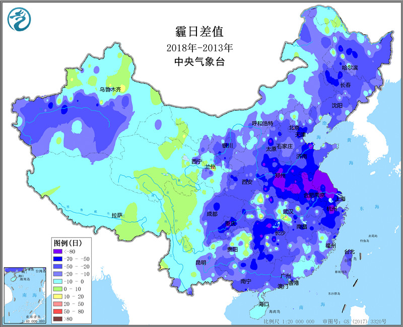 根据中央气象台的统计,全国大部分地区2018年霾日较2013年都有大幅下降,其中京津冀及周边大部分地区霾日数下降超过30天,部分地区下降超过50天;长三角地区霾日数下降普遍超过50天;珠三角地区霾日数也出现明显下降,部分地区下降超过30天;汾渭平原霾日数下降普遍超过20天;川渝地区霾日数普遍下降超过20天。