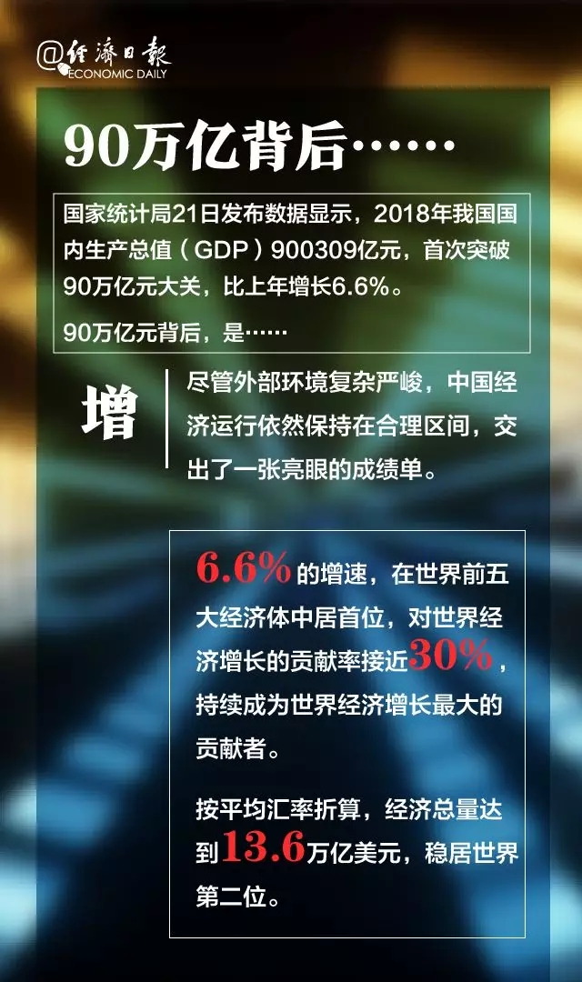 国家统计局21日发布数据显示,2018年我国国内生产总值(GDP)900309亿元,首次突破90万亿元大关,比上年增长6.6%。