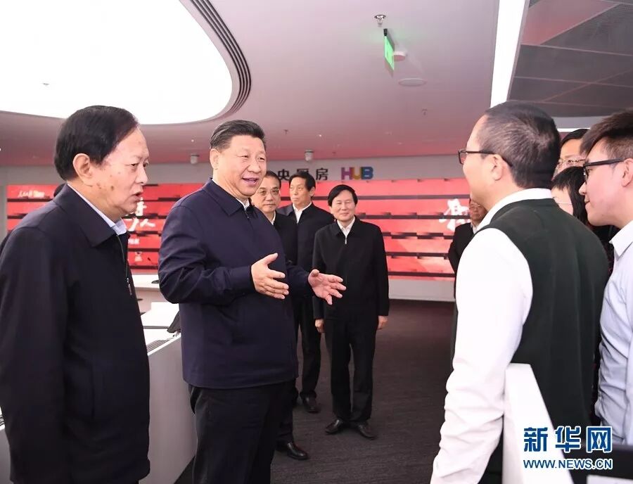 1月25日,中共中央政治局在人民日报社就全媒体时代和媒体融合发展举行第十二次集体学习。这是习近平、李克强、栗战书、汪洋、王沪宁、赵乐际、韩正等在人民日报新媒体中心听取报社微博、微信公众号、客户端建设情况汇报,并观看新媒体产品展示。新华社记者 饶爱民 摄