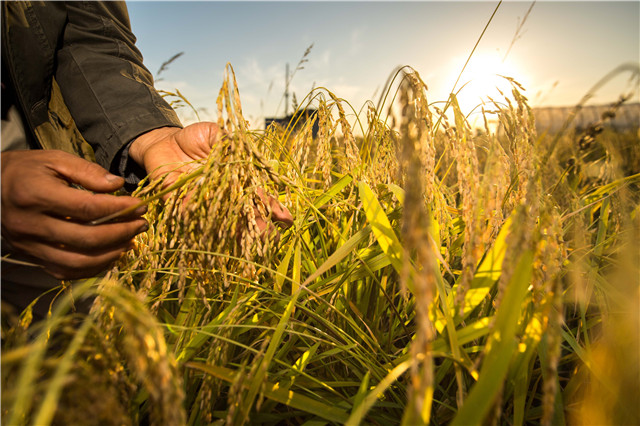 在吉林省舒兰市平安镇,农民在稻田间观察稻穗灌浆情况(2018年9月18日摄)。新华社记者 许畅 摄
