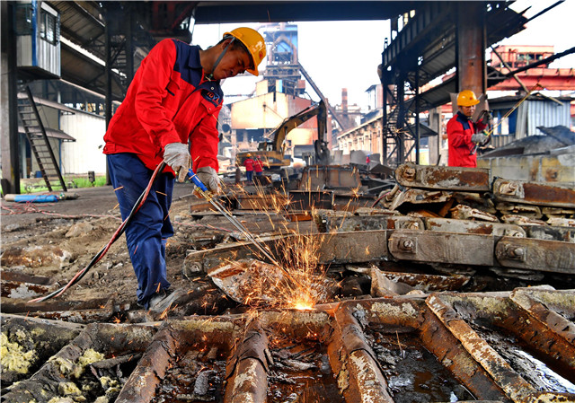 工人在河北唐山市一家停产的钢厂拆除炼钢设备(2018年7月12日摄)。新华社记者 杨世尧 摄