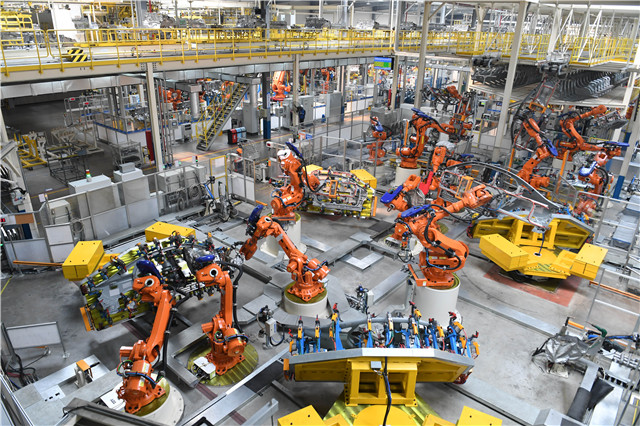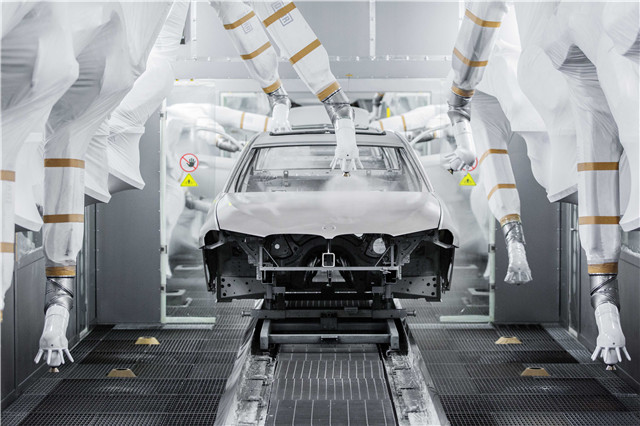 在沈阳华晨宝马汽车有限公司大东工厂涂装车间,涂装机器人为车身进行喷涂(资料照片)。新华社发