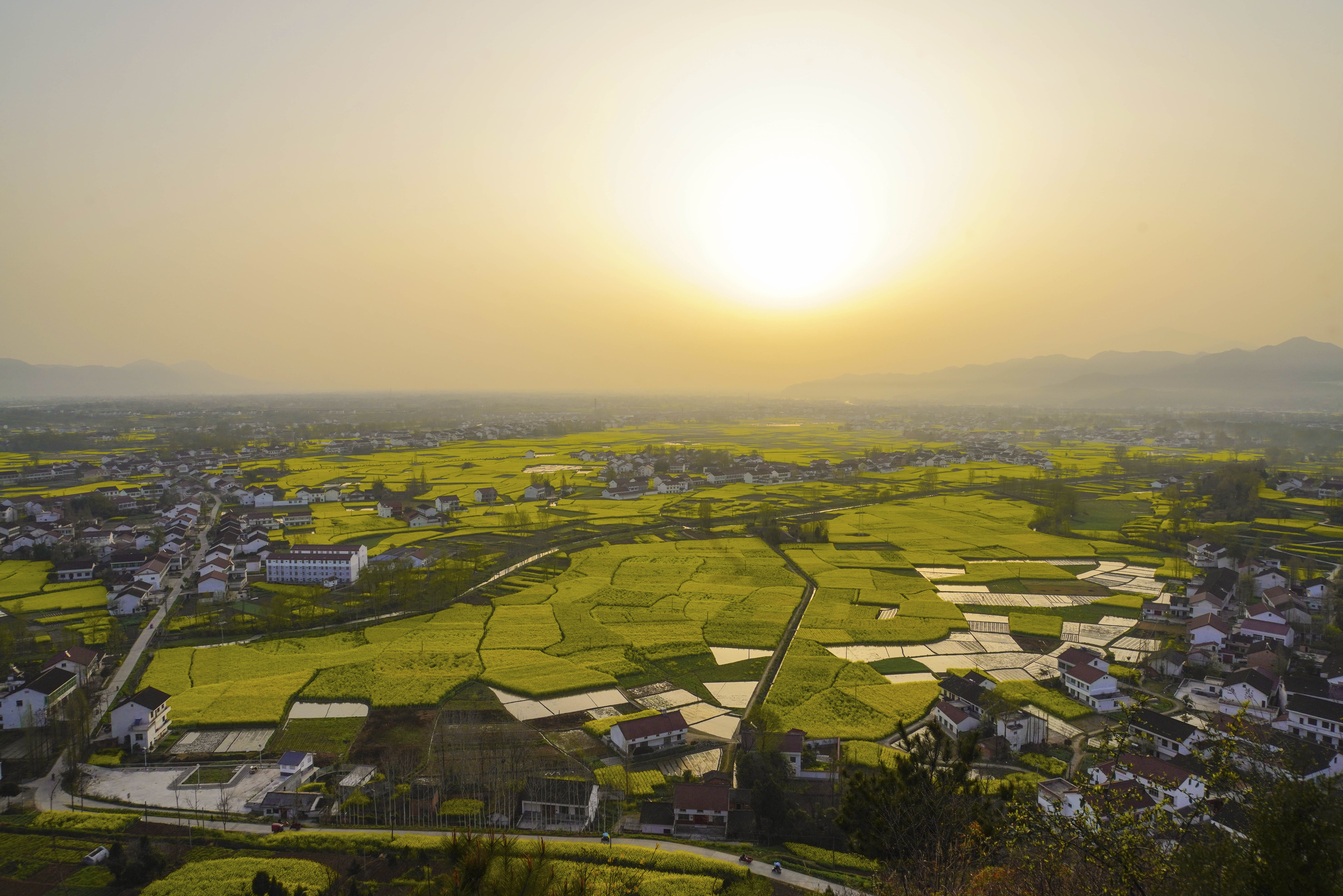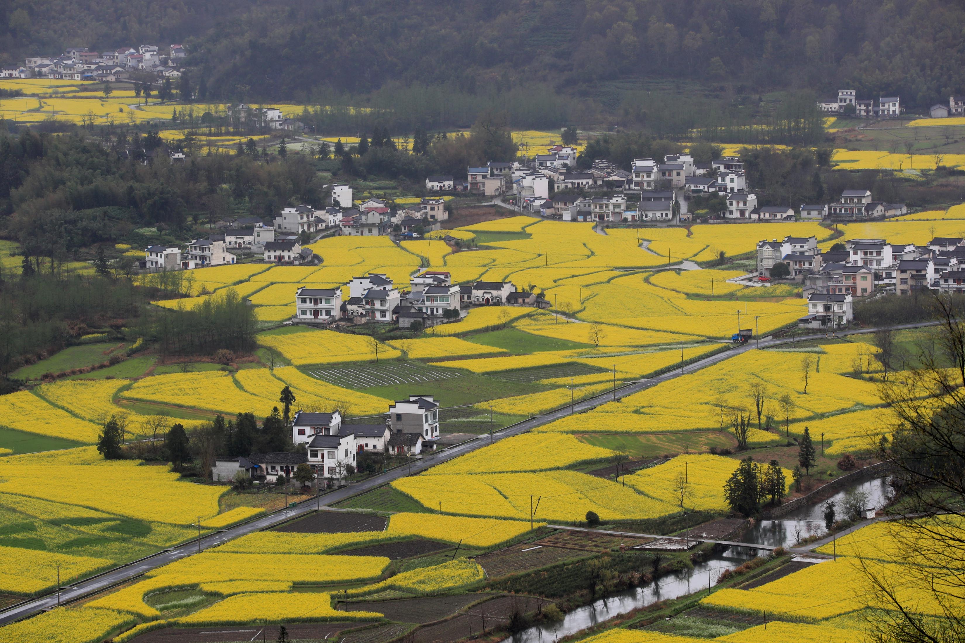 安徽省黄山市黟县柯村镇盛开的油菜花与徽派民居交相辉映(3月28日摄)。 新华社发(施广德 摄)
