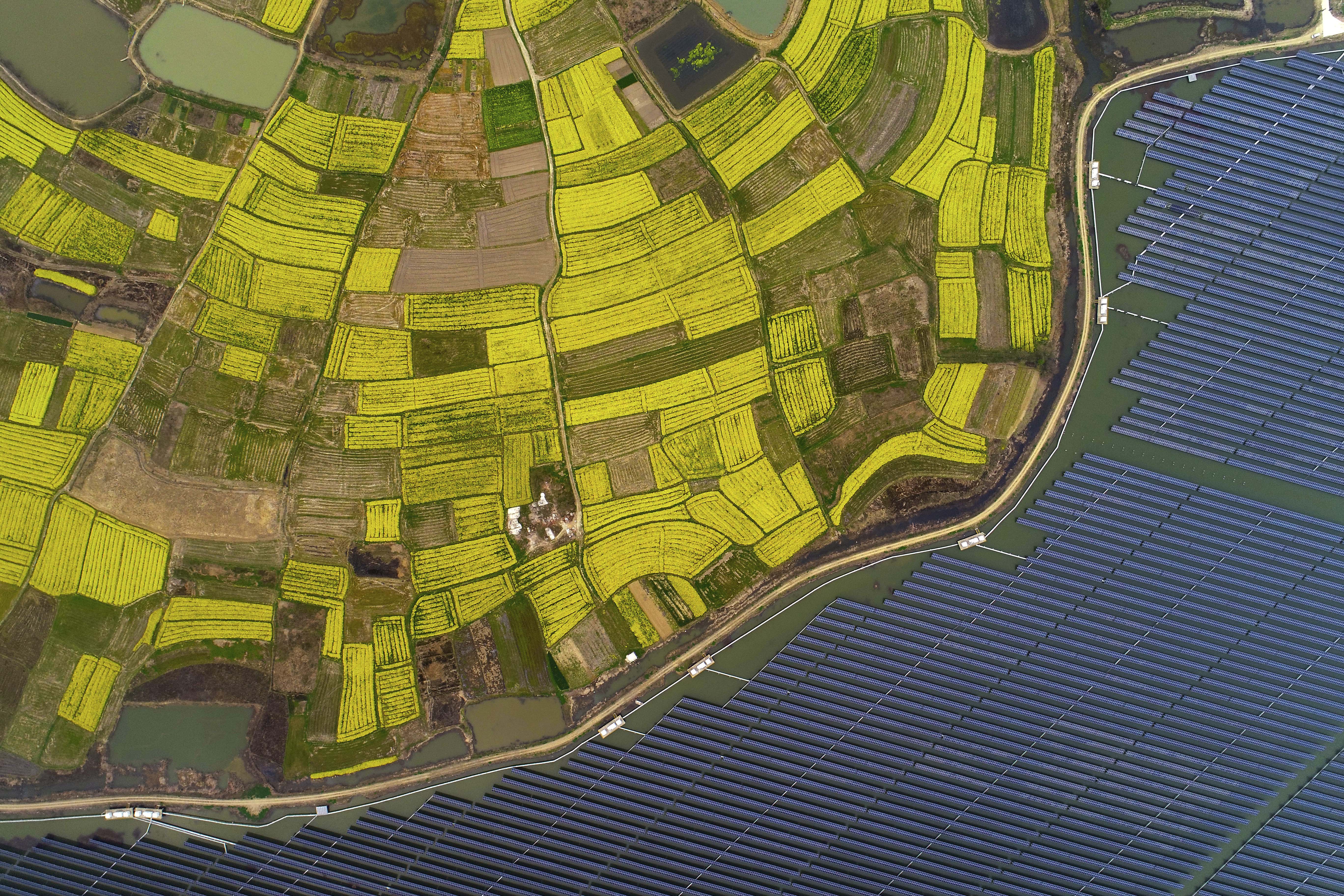 位于安徽省合肥市肥东县梁园镇新河社区的“渔光互补”光伏电站与油菜花田相互映衬(3月28日无人机拍摄)。新华社发(张大岗摄)