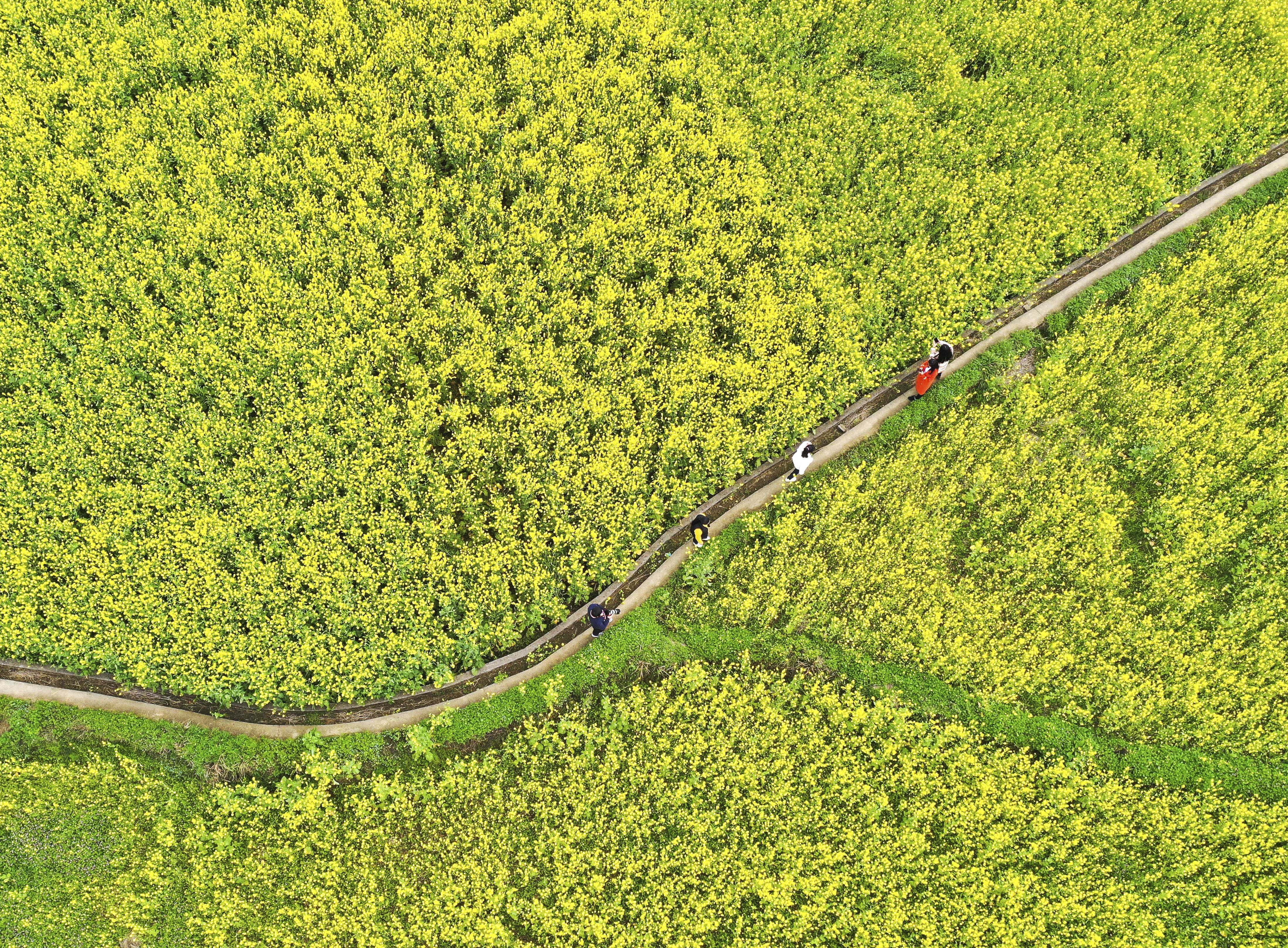 3月28日,游客在贵州省铜仁市玉屏侗族自治县朱家场镇混寨村油菜花田里游览(无人机拍摄)。新华社发(胡攀学 摄)