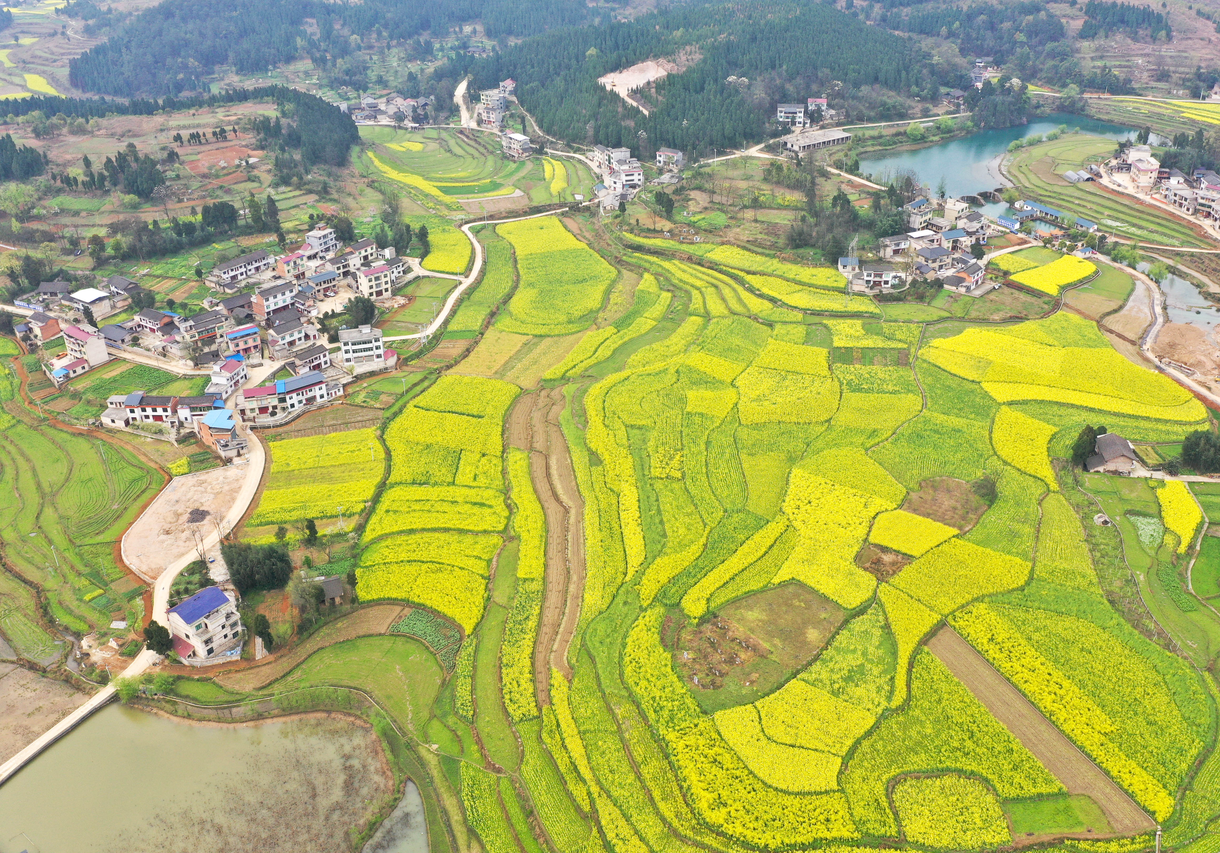 这是3月28日拍摄的贵州省铜仁市玉屏侗族自治县朱家场镇混寨村油菜花田(无人机拍摄)。新华社发(胡攀学 摄)