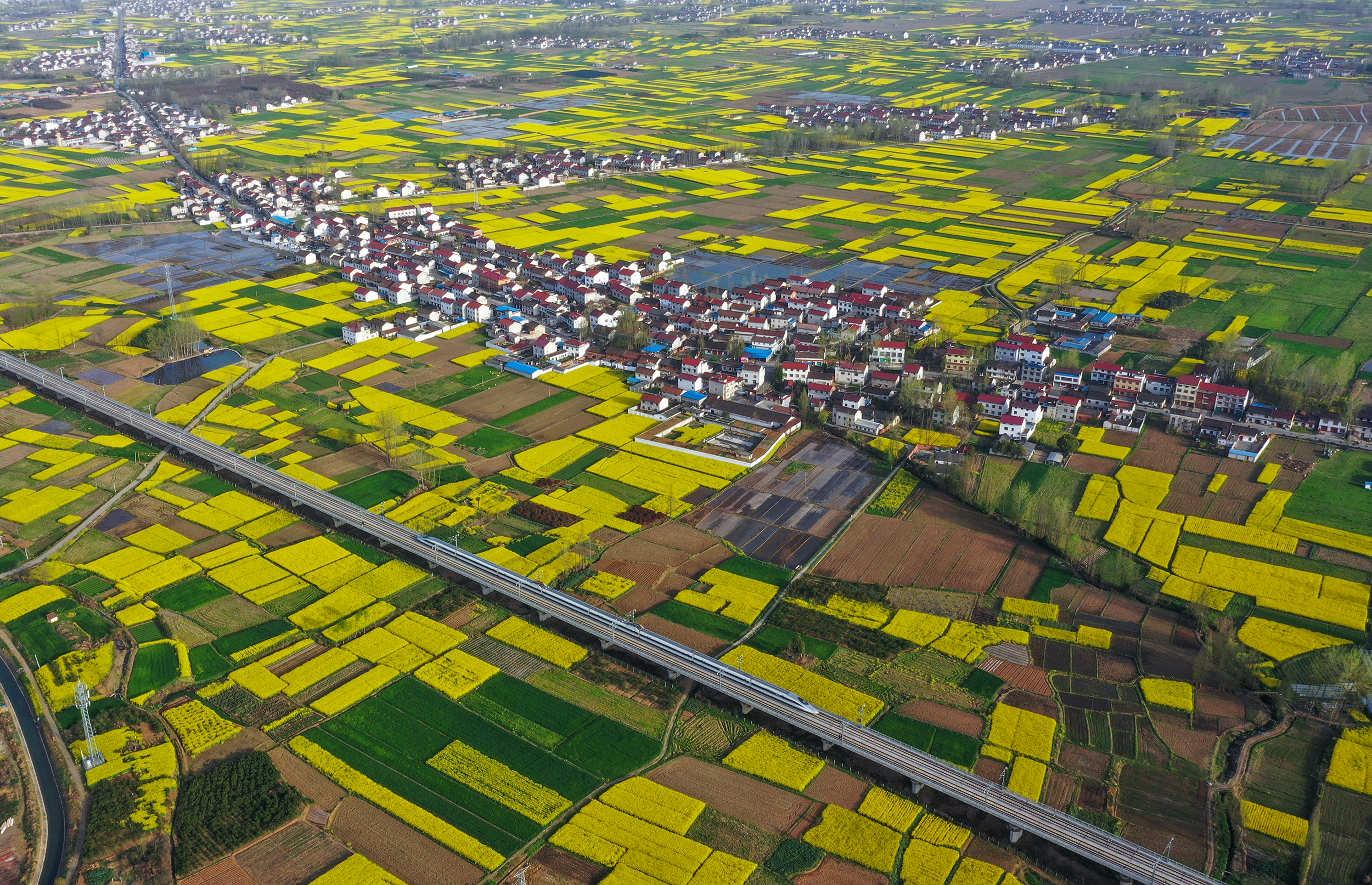 3月28日,在陕西省汉中市城固县境内,高铁穿行在盛开的油菜花田间(无人机拍摄)。 新华社发(罗汉涛 摄)