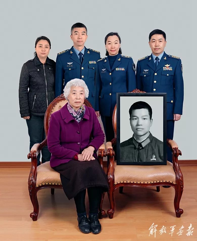 周忠燕母子与丈夫所在部队官兵合影,特意摆上丈夫穿过的旧军装。