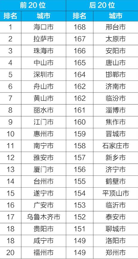 前20位和后20位城市名单