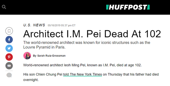 华裔建筑大师贝聿铭于5月16日去世,享年102岁。” 《华尔街日报》:贝聿铭是一个重新审视天际线和创造标志物的建筑师,他作品中优雅的玻璃和金属网格遍布世界。CNN:贝聿铭被视作最后的现代主义建筑师之一,他是首位参与法国卢浮宫设计的外国建筑师,一开始受到人们反对,最后他的作品遍布世界各地,赢得了认可。