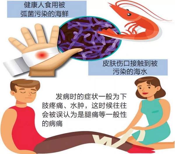 另一种感染途径是破损的肢体接触海水,或海产品刺伤皮肤而感染。细菌通过破损的皮肤很快速传播,并导致严重的肌炎和肌膜炎引发严重的坏疽,继而发生败血症。