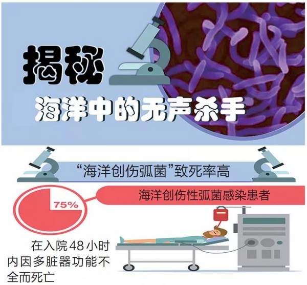 一旦感染上该细菌,发病急,病情发展很快,75%的患者在入院48小时内因多脏器功能不全而死亡,被称为“海洋中的无声杀手”。一般每年夏天为高发时段。