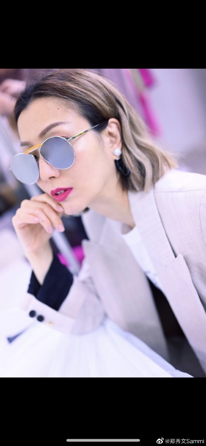 郑秀文面带墨镜搭西装外套干练帅气 粉唇复古大方优雅