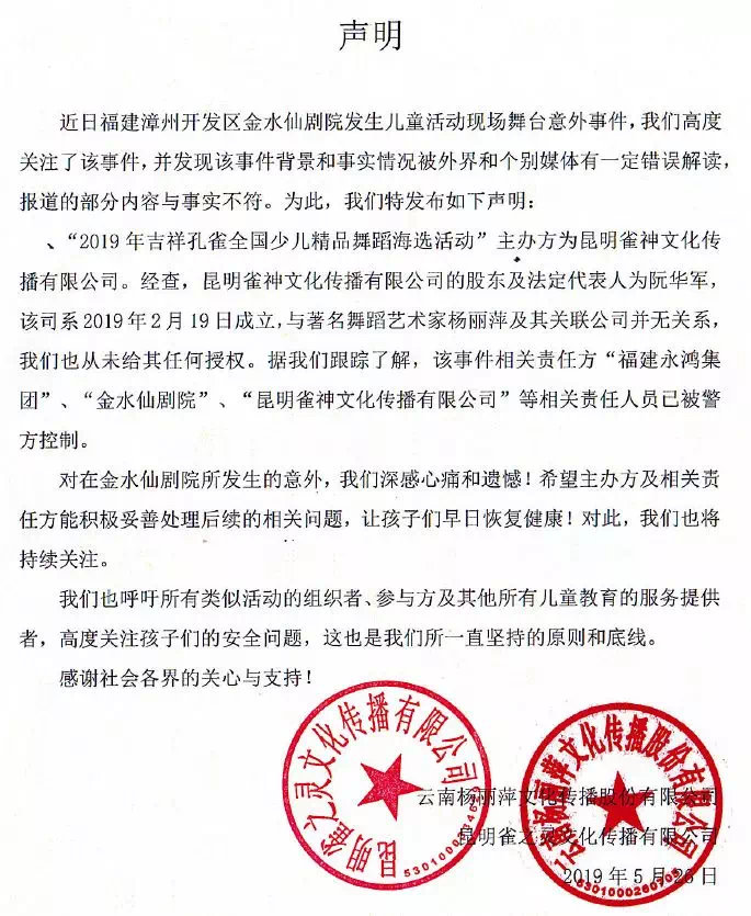 26日晚,杨丽公司在其官方微博发布关于此事的声明,声明称,近日福建漳州开发区金水仙剧院发生儿童活动现场舞台意外事故,本公司高度关注了该事件,并发现该事件背景和事实情况被外界和个别媒体有一定错误解读,报道的部分内容与事实不符。为此,特发布声明如下: