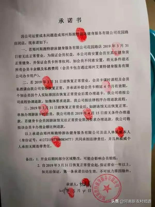 2019年3月4日,郑州斯跑特游泳健身服务有限公司法人林威威给会员们写下保证书,承诺斯跑特花园路店如果在2019年3月31日前无法正常营业,斯跑特将保证会员权益,妥善安置会员到其它健身房锻炼,并享受会员卡所享权利,如会员不同意安置,将无条件退还会员卡余额。