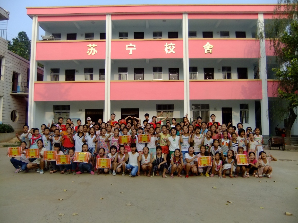 (图:部分建成的“苏宁校舍”,苏宁员工志愿者与孩子们一起分享入住宿舍的喜悦)