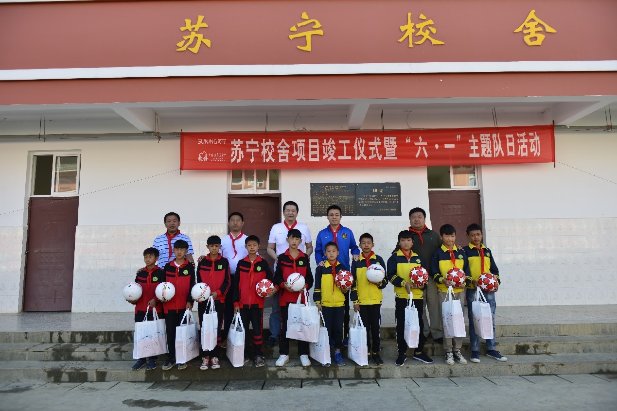 (图:“‘苏宁校舍’项目竣工仪式”在腾冲市东华明德小学举行,苏宁还向学校捐赠运动装备与学习用品)