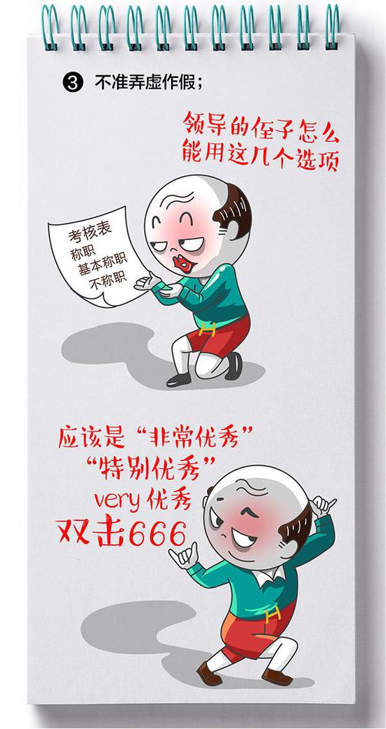 中央纪委国家监委网站“一定之规”栏目近日发布一组漫画《有这些情况,年度考核将与优秀无缘》,形象披露了领导班子和领导干部年度考核结果不得确定为优秀等次的七种情形。