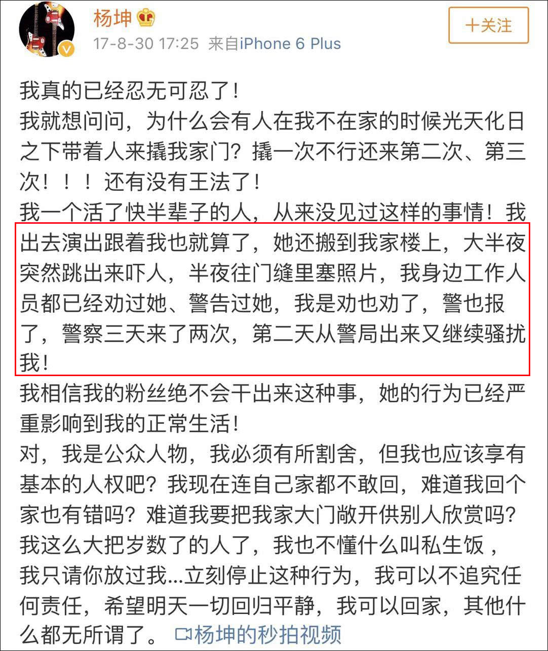 在他的描述中可以了解到:一个私生饭专门搬到了杨坤家楼上,杨坤出门演出她跟着,回家后,她又在大半夜突然跑出来,往门缝里塞照片,虽然工作人员多次劝说、警告甚至报警,对方仍旧继续骚扰。