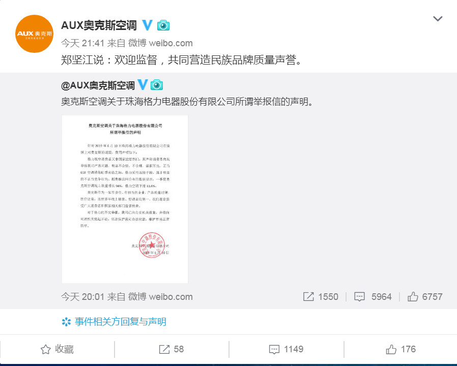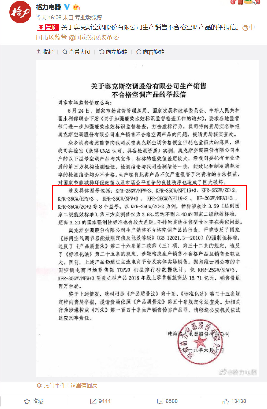 6月10日下午,格力在官方微博置顶发布关于奥克斯空调股份有限公司生产销售不合格空调产品的举报信,并@了国家市场监管总局和国家发改委的官方微博。格力在举报信中称,奥克斯空调股份有限公司生产的8个型号空调产品与其宣传、标称的能效值差距较大,能效比和制冷消耗功率的检测结论均为不合格。
