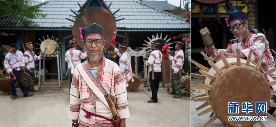 左图:在景洪市基诺山基诺族乡巴坡村拍摄的基诺大鼓舞省级非遗传承人白腊先(基诺族)。在他身后,他的徒弟们在展示基诺族大鼓舞(6月14日新华社记者胡超摄);右图:白腊先在自家庭院制作基诺大鼓(6月14日新华社记者秦晴摄)。